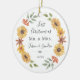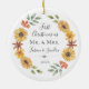 Elegante adorno navideño con una corona de girasoles, personalizado con el texto "Primera Navidad como Sr. y Sra.", los nombres de la pareja, y un año. Diseño de doble cara.