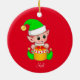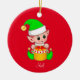 Navidades cortos sosteniendo una caja de regalo sobre un adorno de cerámica roja.