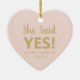Invitación de compromiso falso oro y color rosa lindo corazón personalizado foto Navidades de texto de cerámica ornamento. Texto del personalizable ¡Ella dijo que sí! Puedes personalizar el texto y la foto y convertirla en tu propio