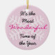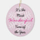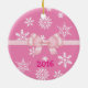 Es el Ornamento de Navidad Rosa de los Tiempos más Maravillosos del Año con copos de nieve blancos de bonito y un punto de polka blanco con arco rosa y cinta adhesiva en la parte de atrás. ¡Asegúrate de editar el año atrás!