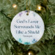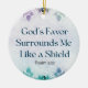 La protección de Dios no es solamente una promesa —es personal". Este elegante ornamento presenta la poderosa escritura del Salmo 5:12: "El favor de Dios me rodea como un escudo". Este adorno se convierte en un recordatorio muy significativo de la protección y el favor divinos. Ya sea que estés celebrando una nueva temporada, ofreciendo ánimo, o simplemente recordándole a alguien que están cubiertos de gracia —este adorno hace que la fe se sienta cercana y personal