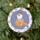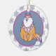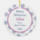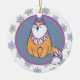 Este es un adorable adorno navideño personalizado para regalar a un hijo, hija o nieto. En la parte delantera hay una adorable imagen de zorro de estilo nórdico en el centro. La imagen está realizada en colores azul oscuro, rosa violeta, blanco y dorado, y colocada sobre un fondo gris azul enmarcado en rosa violeta. A continuación, la imagen enmarcada se coloca sobre un fondo de copo de nieve azul y blanco similar. La parte posterior del ornamento tiene el mismo marco de copo de nieve con el texto azul personalizado y violeta en el centro circular blanco. ¡Haz que diga lo que quieras! Este diseño funciona igualmente bien para un niño o un chica.