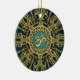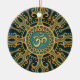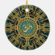 Un símbolo de Aum o de OM se sienta dentro de un diseño elaborado del sol. La estrella se compone de ocho rayos stylized que estiren hacia fuera como los rayos de un círculo en el centro. Las líneas y los puntos complejos se colorean con un amarillo de oro que se destaque para dar al modelo un brillo ligero en la superficie. El fondo es el azul profundo pintado que se puede ver a través del espacio negativo del sol. Una sombra aparece apenas debajo del diseño que lo hace parece flotar apenas sobre la superficie del ornamento. Este diseño elegante es una representación llamativa de este símbolo espiritual.