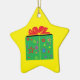 Añade un toque de color a tu árbol con un adorno personalizado, hecho de porcelana blanca. Esta es una estrella en forma de estrella con un regalo en el centro, sobre un fondo amarillo brillante. Puedes diseñar tus propios ornamentos personalizados de árbol de Navidad para los niños, con fotos, un boda, y los puedes diseñar con un mensaje personal, en ambos lados. Cada uno tiene una elegante cuerda de oro fijada que los hace fáciles de colgar.