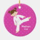 Personalice fácilmente este adorno navideño de artes marciales para niños. Un bonito ilustracion chica de pelo marrón, con un uniforme blanco y un cinturón blanco sobre fondo rosa con estrellas. Perfecto para cualquier estudiante de karate o taekwondo. ANTES de realizar su pedido — Contáctenos para CAMBIOS GRATUITOS DE COLOR (color de cinturón, pelo, color de fondo, etc.)