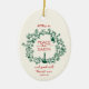 Añada un toque significativo a su decoración navideña con este adorno cristiano personalizado de Navidad. Inspirado por Lucas 2:14, "Que haya paz en la tierra y buena voluntad hacia los hombres", el frente presenta una corona verde dibujada a mano y un diseño de velas en un fondo de marfil. La parte posterior se puede personalizar con el nombre de su familia, el año de los Navidades y los nombres de cada uno de los miembros de la familia, creando un recuerdo muy querido para que se muestre año tras año. Perfecto para celebrar la fe, la familia y la alegría de la temporada, este adorno hace un regalo cuidadoso o una adición atesorada a su propio árbol.