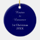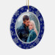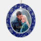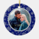 Este es un adorno navideño especialmente elegante que presenta tu fotografía en un marco bonito de copos de nieve de plata sobre un fondo azul. El marco del patrón de copo de nieve tiene un forro de diamante falso interior. La parte trasera del adorno tiene el texto de tu personalizado en plata sobre un fondo azul; ¡haz que diga lo que quieras! Un regalo elegante y festivo para recién casados o cualquier pareja. *Atención: la imagen está impresa y no contiene purpurinas ni joyas.*