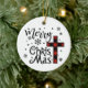 Ornament muestra las palabras 'Merry Christ Mas' en escritura decorativa negra con una Cruz Cristiana de seda roja y negra como la "t" en Navidades y acentos de copos de nieve.