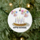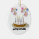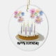 Este adorno está decorado con un pastel de cumpleaños, fuegos artificiales y el texto "Feliz cumpleaños"