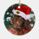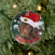 Este adorable adorno de cerámica cuenta con una foto de un adorable perro labrador de chocolate con gorra de Santa Claus, sentado cerca de un árbol de Navidad decorado, y las palabras "Felices Fiestas".