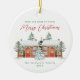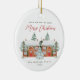 Este hermoso adorno vacacional cuenta con casas pintadas de invierno decoradas para Navidades con bonitos y pinos nevados. El texto dulce "Feliz Navidad desde nuestro hogar al tuyo" está incluido con nombre personalizado y el año en curso. La parte trasera es una estancia agradable gracias al saludo a tus grandes amigos de al lado.