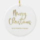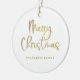 Este sencillo y elegante ornamento de festividad dorada y blanca dice "Feliz Navidad" en la moderna y casual tipografía de escritura.