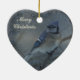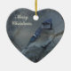 Imagen suavizada de un Jay Azul en una tormenta de nieve con el saludo "Feliz Navidad".