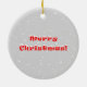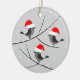 Este adorable ornamento cerámico Navidad cuenta con un ilustracion de tres pájaros sentados sobre ramas de árboles cubiertas de nieve. Los pájaros llevan sombreros de Santa Cruz y disfrutan de una suave nevada. El ilustracion se realiza en tonos grises restringidos para destacar la alegría del color rojo intenso de los gorras. La parte de atrás del adorno tiene letras rojas que dicen "¡Feliz Navidad!" Las cartas están ligeramente cubiertas de nieve también. Excelente decoración y regalo para amigos y familiares.