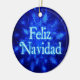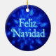 Un enjambre de copos de nieve fractales azules. El texto en español que dice "Feliz Navidad" aparece en azul y blanco brillante.