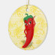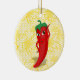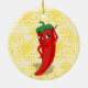 Un personaje de dibujos animados de pimiento rojo y picante. Diseño original con patrón de encaje dorado (impresión amarilla) en el fondo.