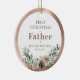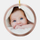 First Christmas as Father Personalized with Baby's Name, Birthdate, and Photo Round Ceramic Keepsake Ornament... A sweet bouquet of pink roses, pine cones, and holiday season botanicals decorates the rose gold metallic frame circling the text on front of your Christmas ornament gift for fathers. On back of the ornament is the baby's photo also framed by metallic rose gold. The example wording on this keepsake ornament reads "First Christmas as Father of Bethany Westfield 05.15.2025". All example text and the placeholder photo can be easily revised with your own on the personalization template.