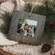 Minimal and modern simple photo keepsake, a new home ornament to commemorate your first Christmas in your new home. The design features a clean, minimal layout with a square photo frame to showcase your special new home photo. A subtle faux woodgrain tray ombré background adds warmth and texture to both the front and back of the ornament, enhancing its modern aesthetic. The phrase "Our First Christmas," along with the year and family name, is displayed in a simple, elegant font around the photo. This is a two-photo ornament, with one photo on the front and a second photo on the back—perfect for capturing both the exterior and interior or special moments in your new space.