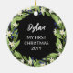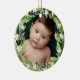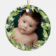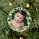 Hermoso adorno de Navidad floral con tu foto dentro de una corona floral de flores de vegetación verde salada, flores blancas y bayas azules. Añade el nombre de tu bebé y el año atrás.