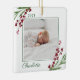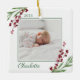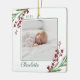 El primer ornamento navideño de un hermoso bebé festivo. Nuestro diseño cuenta con una hermosa vegetación de arándanos acuáticos en las esquinas del adorno. Personalizar con su foto, año y nombre. Diseño de Moodthology Papery