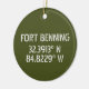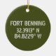 Ornamento cerámico de mantenimiento de Navidad con coordenadas de mapa de latitud y longitud para Fort Benning - Colón, estilo esténcil de Georgia tipo fuente blanca sobre fondo verde del ejército. Personaliza con el nombre o las fechas de atrás.