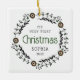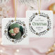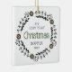 Celebra la primera Navidad del bebé con este adorno de sake, con una corona de arte folclórica al estilo escandinavo de vegetación y flores garabateadas. La palabra "Navidades" aparece en verde. Personalice el adorno con el nombre del bebé y el año con el tipo de letra sans serif negro en un lado y su foto favorita en el otro.