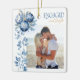 Adorno de foto Engaged and Bright - perfecto para regalo de compromiso o primera Navidad de parejas comprometidas. El diseño presenta adornos de burbujas azules con delicado follaje invernal para enmarcar tu foto y está elegantemente escrito con Engaged and Bright. El otro lado del adorno tiene una segunda foto enmarcada con los nombres de la pareja y el año (u otro texto personalizado).