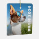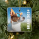 Ornamento de fotos con la foto de su mascota personalizado con el nombre del mascota en un divertido tipo de letra como un superpuesto de texto blanco arreglado verticalmente en el lado derecho.