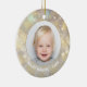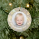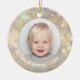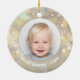 Tu foto favorita aparece en la parte delantera y trasera de este adorno de cerámica redonda con copos de nieve dorados en un fondo Navidad de luces de bokeh, estrellas y puntos. ¡Sube tu propia imagen para crear adornos de árbol de Navidad para ti mismo o como regalo para la familia, amigos, padres y abuelos! MÁS materiales, formas y DISEÑOS en nuestra tienda.
