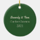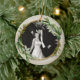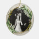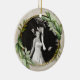Elegante ornamento de fotos redondas, con gráficos de un marco de corona de bonito con follaje verde. El texto de atrás es personalizable y listo para personalizar. Maravilloso recuerdo que conserva el adorno para los recién casados.