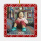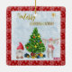 Este adorable ornamento presenta dos diseños diferentes. Por un lado, subes tu propia foto de tu hijo, familia o mascota y agrega su nombre. Hay un borde rojo y blanco de copos de nieve. El otro lado tiene una escena caprichosa de un árbol de Navidad decorado con muchos regalos debajo, un Papá Noel Gnome y un alce con una bufanda roja y blanca y un sombrero de Papá Noel. Sus cuernos están decorados con medias de Navidad y adornos. En la parte superior dice: Feliz Chris Moose en Relieve metalizado de oro. El año está en la esquina inferior derecha, así que actualícelo según sea necesario. El fondo es un azul pálido con copos de nieve y una estrella dorada en la esquina. El mismo rojo con el patrón blanco de copos de nieve que está en el frente está alrededor del borde.