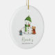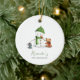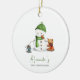 Adorable adorno de primer Navidad para bebé con una ilustración exclusiva de un muñeco de nieve adorable y algunos amigos animales en un lado. En el otro lado puedes agregar la foto de tu bebé. Una excelente manera de celebrar y atesorar la primera Navidad de tu bebé y un gran recuerdo para los abuelos y otros miembros de tu familia. Ilustrado y diseñado por Patricia Alvarez.