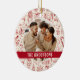 Haz que tu árbol sea especial con un adorable adorno navideño. Un cálido telón de fondo crema y ilustraciones rojos peculiares de Santa, una casa de jengibre, regalos, campanas, copos de nieve, medias, petardos y dulces enmarcan una preciosa foto y el nombre de tu familia en el centro. agrega este adorno único a tu colección de vacaciones hoy.