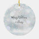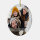 Adorno de cerámica con copos de nieve y foto familiar moderna de vacaciones. Personalízalo con tu foto familiar favorita, añadiendo tus nombres y fecha para crear un regalo único y un recuerdo especial.