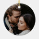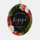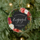 Elegante foto adornada con "Nuestra Primera Navidad Comprometida" junto con sus nombres y el año rodeado por una corona floral de color agua con vegetación, flores grises y blancas sobre un fondo negro. El trasero tiene tu foto favorita. Guarda este adorno para celebrar tu compromiso o regalar a una pareja su primera Navidad prometida.