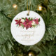 Elegante ornamento de compromiso fotográfico con poinsettias acuarelas en rojo junto con "Nuestra primera Navidad comprometida" y sus nombres y año en oro. El trasero tiene tu foto favorita. Guarda este adorno para celebrar tu compromiso o regalar a una pareja su primera Navidad prometida.