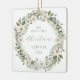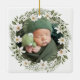 Celebre la primera Navidad del bebé con este adorno de sake, con una cortina de flores blancas y vegetación de color agua. La palabra "Navidades" aparece en un delicado guión de escritura a mano verde. Personalice el ornamento con el nombre del bebé y el año con el tipo de letra verde sans serif en un lado y su foto favorita en el otro.