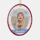 Primer ornamento de bebé de Navidad moderno, elegante y lindo personalizado para bebés gemelos para un padrino con un marco blanco con copos de nieve y estrellas que tiene una apertura redonda para una foto horizontal personalizado, y una banda azul curvada a cada lado en la que aparece el nombre o los nombres de los gemelos en un elegante tipo de letra / tipografía de escritura. Este diseño incluye en la parte delantera las palabras "¡Te queremos, abuelo Jason!", que puedes personalizar o borrar. En la parte de atrás hay un texto personalizado para el año de la primera Navidad de los bebés. Con un marco rojo exterior de Navidad.