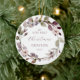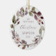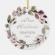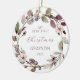 Celebra la primera Navidad del bebé con este adorno de sake, con una corona de color de hojas moradas y verdes, bayas moradas y flores rosadas. La palabra "Navidades" aparece en un delicado guión de escritura a mano morada. Personaliza el ornamento con el nombre del bebé y el año con el tipo de letra púrpura sans serif en un lado y tu foto favorita en el otro.