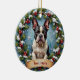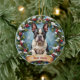 A beautiful, ultra-detailed Christmas ornament design featuring a realistic portrait of the breed centered within a soft, festive winter frame. This elegant design includes pine branches, red berries, and snowflakes against a snowy backdrop, illuminated by warm holiday lighting. The balanced, round composition includes clear space below the dog for customization.