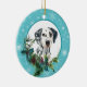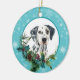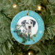 En la parte delantera de este adorno navideño hay un hermoso retrato de un perro dálmata asomándose a una masa holgada y verde. Las bayas rojas y los conos de pino decoran los estribos de pino y de hojaldre. La imagen se coloca sobre un círculo blanco enmarcado por un patrón de copos de nieve azul retro. La parte posterior del adorno tiene el mismo fondo y círculo con el texto personalizado en azul sobre un fondo blanco.