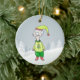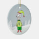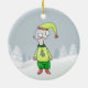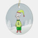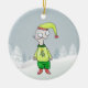 El personalizado elfo chismoso vestido con un suéter verde con un diseño de árbol de Navidad, luce un gorra verde y rojo y zapatos rojos a juego. Personalizado original de Taylor Addams. Artista. Mensch.
