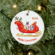Un hermoso gato siamés se sienta entre paquetes de regalo envueltos en colores vivos en un trineo de Navidades rojos y dorados. En la parte superior hay un campo de texto que se puede personalizar para su nombre o el año en curso. En la parte inferior hay otro campo de texto personalizado que dice "Feliz Navidad". Ambos lados del adorno tienen la misma imagen.