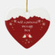 A beautiful heart shaped ceramic ornament to celebrate a gay newlywed couple's first Christmas as Mr & Mr. Two cute modern robins share a romantic kiss in the snow on the front of this adorable red ornament. They both are wearing a top hat, and tiny snowflakes are falling around them. The illustration of the sweet little robins is also on the back. Personalize it with their names, and a write a short message to make it a lovely gift to keep forever.