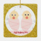 Diseño, elegante, y lindo personalizado Ornamento de niñas de niños gemelos de primera Navidad para padrinos con un marco blanco con copos de nieve y estrellas en un (falso) fondo purpurina dorado. El frente tiene una apertura redonda para una foto de personalizados gemelas y abuelos y dos prohibiciones rosadas en las que aparecen los nombres de los recién nacidos en una escritura moderna tipo de letra / tipografía, y el otro texto personalizado, "Nuestra primera Navidad como abuelos". La parte trasera tiene una imagen de bebés gemelos, que se pueden mantener o reemplazar con una foto, y el texto del personalizable "Primera Navidad 202Y" en una banda rosa.