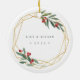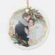 Elegante ornamento fotográfico de Navidad presenta una foto favorita rodeada por un falso marco geométrico de Relieve metalizado dorado con follaje color agua verde y bayas rojas. Agregue sus nombres y el año, o un mensaje personalizado, al reverso en un marco coincidente.