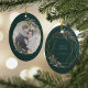 Elegante foto adorno de Navidad presenta una foto favorita rodeada por un falso marco geométrico oval de Relieve metalizado dorado con follaje color agua verde y bayas rojas. Añada sus nombres y el año, o un mensaje personalizado, al reverso en un marco geométrico delicado que coincida.