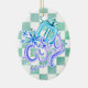 Double-sided porcelain oval ornament featuring trendy “Gifty Time” hand-painted lettering in icy blue and purple with delicate snowflakes and swirls on a mint-green checkerboard background. Perfect modern Christmas tree keepsake, holiday gift, winter wedding favor or stylish seasonal decoration.