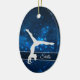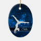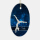 Este elegante adorno cuenta con una silueta plateada en un atril con fondo azul bonito y pequeñas estrellas de luz. Su nombre es plateado en una pancarta semitransparente enmarcada en un falso purpurina blanco. La parte posterior del adorno tiene el mismo fondo azul con tres campos de texto personalizados en el centro de un lujoso cartel enmarcado con diamante falso. Perfecto para esa hija, nieta o sobrina que es gimnasta.