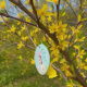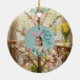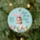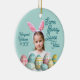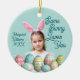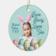 Special Easter gift for your dear ones, Girl Photo with funny Easter Bunny Ears and painted eggs on blue background on your own Easter ceramic ornament. May be a keepsake for yourself, or a personalized gift for a friend or family member. Generative content images may be changed. Humor Greeting saying, "Some Bunny Loves You" , the girl's name and the year on the front of the ornament. If you replace the girl photo with your own, please use the option "remove background" from edit menu.